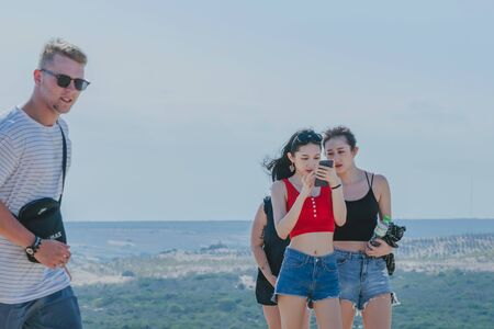 Portugal, Sintra, June 26, 2018: Asian tourist girl takes a picture of her friend on a cell phone at Cape Roca. Nearby are other tourists.