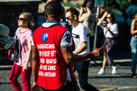 Rome Italy September 29, 2019 View of a tour guide working near the Coliseum also known as the Flavian Amphitheatre in the center of the city of Rome