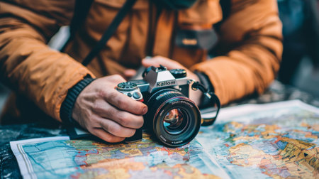 A person holds a camera in front of a vibrant world map, symbolizing the spirit of adventure and exploration. The image captures the essence of travel photography.