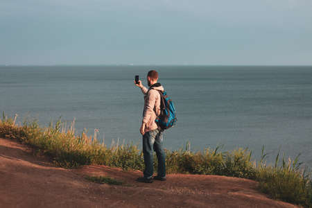 Bearded man in raincoat with backpack on sea landscape with blue cloudy sky background with smartphone in hand taking picture. Guy photographing nature on cell phone, active lifestyle travel concept.