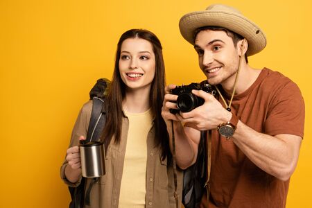 couple of smiling tourists with backpacks holding photo camera and coffee, isolated on yellow