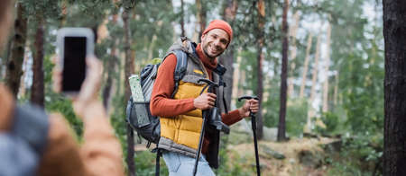 blurred woman taking photo of cheerful boyfriend on smartphone with blank screen, banner