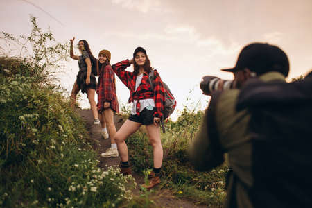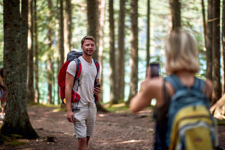 Selective focus shot of young woman taking pictures of her best friend on smartphone camera while hiking together around quarry lake