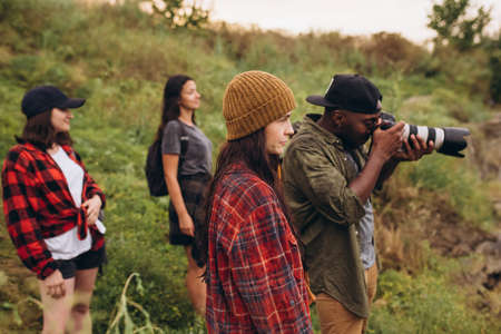 Young woman is taking a photo of her friends on digital camera at autumn forest.
