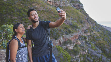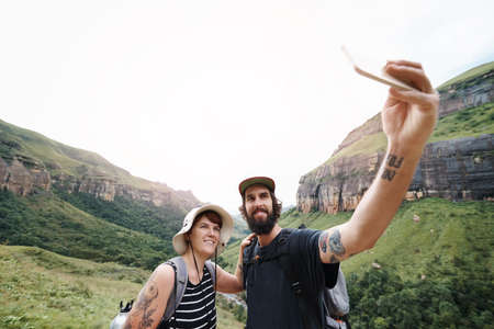 Shot of a young couple taking a selfie while out on a hike through the mountains