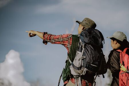 Asian Group of young people Hiking with friends backpacks walking together and looking map and taking photo camera by the road and looking happy ,Relax time on holiday concept travel