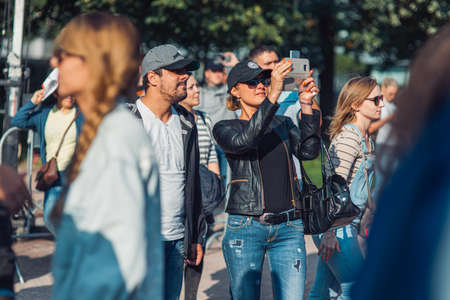 Moscow, Russia - SEPTEMBER 9, 2016: A woman in a crowd photographs city views on the phone using 5G internet