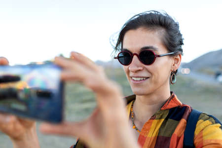 Young hip woman with a backpack exploring and photographing the coast on a beautiful day. Concept of exploration and adventures