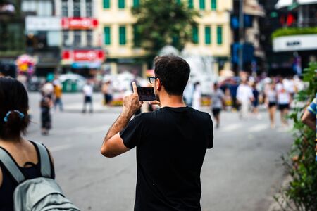 A proud and happy caucasian father records his sons dance performance on a smart phone in an Asian City during a hot day