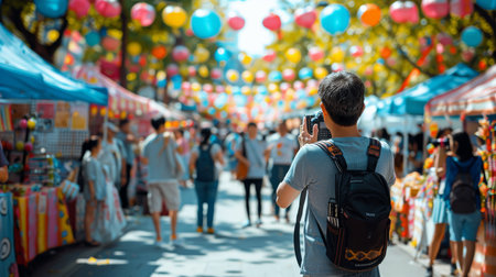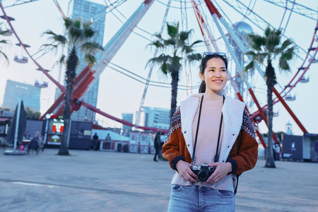 A stylish traveler stands in front of a large ferris wheel, holding a camera, wearing a casual jacket and denim, capturing a cheerful outdoor moment at a palm tree lined boardwalk