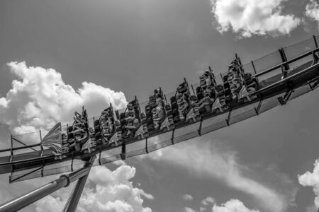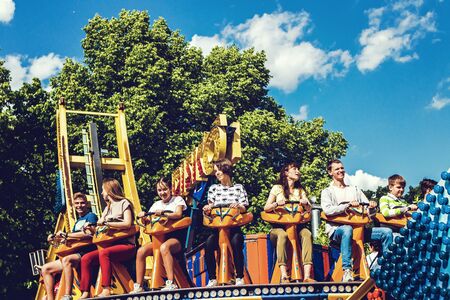 the entertaining process of riding a roller coaster to make people happy and let them express their emotions. carefree weekend happy people day