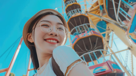 Happy asian woman smiling and taking selfie photo on a ferris wheel