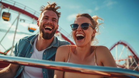 A happy couple in love found the perfect entertainment for themselves in a theme park. Laughter and fun accompany a man and a woman during a roller coaster ride on a sunny day