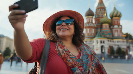 A joyful Hispanic woman enjoys taking a selfie against a stunning city backdrop, showcasing her vibrant personality and the beauty of travel.