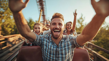 A vibrant scene capturing a joyful group on a roller coaster, arms raised in excitement, showcasing the thrill of amusement park adventures and togetherness.