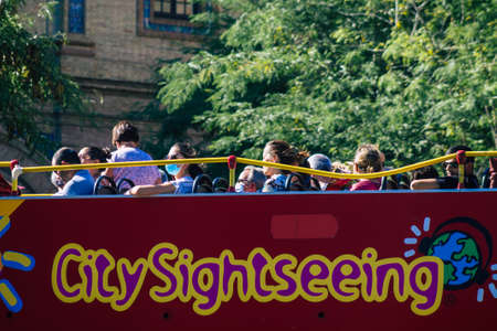 Seville Spain September 18, 2021 Tourist bus driving through the streets of Seville during the coronavirus outbreak hitting Spain, wearing a mask is mandatory