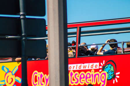 Seville Spain August 11, 2021 Tourist bus driving through the streets of Seville during the coronavirus outbreak hitting Spain, wearing a mask is mandatory