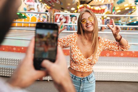 Image of a man take photo of his happy woman walking outdoors in amusement park by mobile phone.