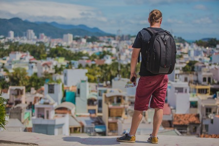 Guy takes pictures of the city on a phone. Tourist near attractions. A traveler uses a digital gadget for photos