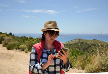 Girl tourist looking in a mobile phone while standing outdoor on a sunny day