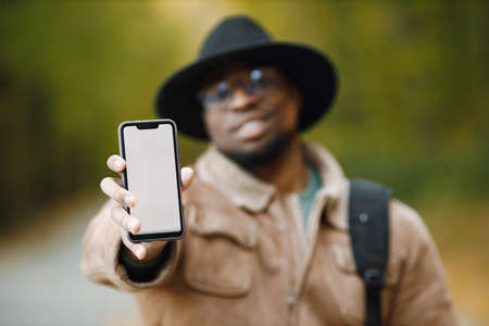 Traveler man with backpack makes photos or selfie on a smartphone, his phone with river and mountains in blurred background, Lifestyle.