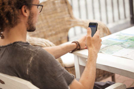 Man backpacker using smartphone relaxing on mountain top traveling alone. lifestyle active vacations modern technology millennials concept. Marvelous daybreak. mock up text.