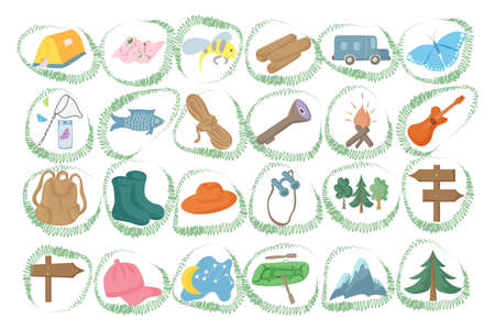 Cute cartoon travel and camping icons set in flat style. Vector illustration
