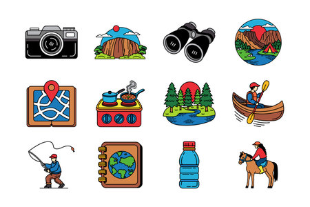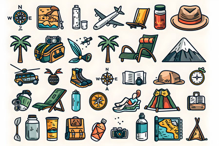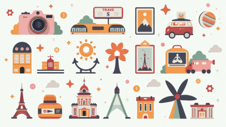 A colorful array of travel-related icons featuring means of transport, vacation spots, and adventure gear Perfect for showcasing travel and discovery themes