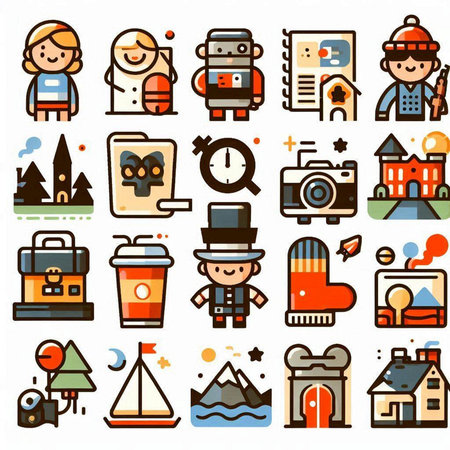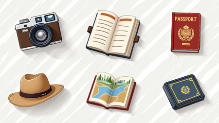 Collection of travel icons including a camera, a suitcase, a backpack, and a passport. The icons are arranged in a grid, with some icons overlapping each other. Scene is that of adventure