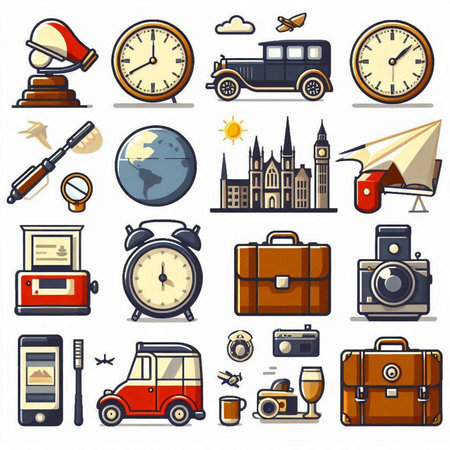Travel icons and landmarks in retro style: camera, eiffel tower, train, windmill, van. That the image is generated using AI.