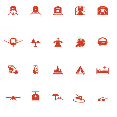 Simple icons for travel, tourism, sports and recreation in vector. Symbols in red.