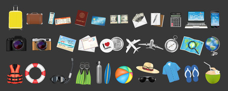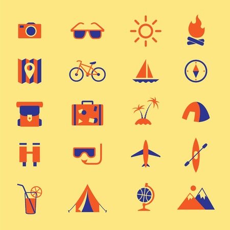 Travel and tourism flat icons set. Collection of luggage, camera, passport, map, ticket, passport, airplane, compass, binocular, compass and other elements. Vector illustration