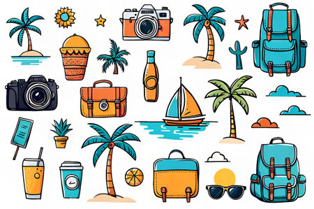 collection of tropical themed items including a camera, a backpack, a cell phone, a cup, a bottle, a suitcase, a palm tree, a boat, a bottle, a cup, a cell phone, a backpack, a palm tree,