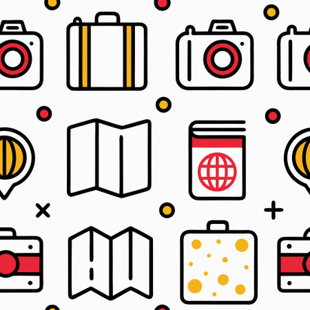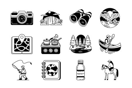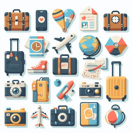 Travel icons illustrate essential items like luggage, maps, and cameras, perfect for representing various travel activities in a minimalistic style