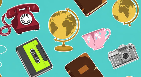 This vintage-inspired repeating pattern a collection of educational and travel-themed on a teal background. Key include globes, books, a classic red rotary telephone, a bright green cassette tape, and a vintage camera. The flat style is clean and charming, with a palette of warm and cool colors. This pattern is backgrounds, educational or any that requires a touch of retro sophistication and a sense of exploration.