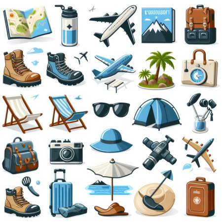 An array of travel essentials showcases outdoor adventure tools including a map, backpack, and camera. Items like sunglasses and hiking boots are perfect for exciting trips under the sun..