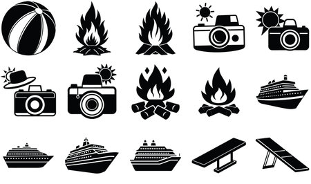 A collection of black and white vector icons depicting elements of a summer vacation including a beach ball campfires cameras with sun and hats and cruise ships.