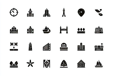 Set of simple, black and white icons representing various city landmarks and elements. These icons are suitable for use in a variety of applications, such as maps, websites, and other graphical user interfaces.