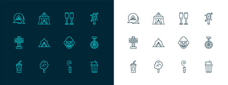 Set line Magic hand mirror Cotton candy Clown head Birthday party horn Circus tent Bowling pin and icon. Vector.