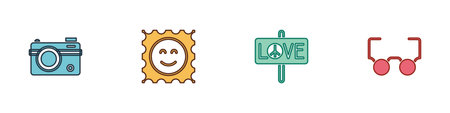 Set Photo camera, LSD acid mark, Peace and Glasses icon. Vector.