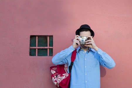 Hipster traveler with camera in Asia. Portrait of handsome young man in hat and sunglasses with backpack and camera in his hand.