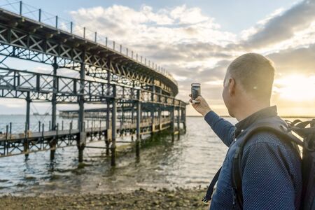 Man photographing sunset on the beach with smartphone
