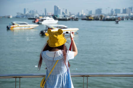 Pattaya Thailand - November 18 , 2021: Young woman standing at the harbour, taking pictures with her digital photo camera of the scenery during her vacation with her digital photo camera.