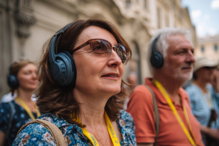 A group of tourists enjoys a guided audio tour in a historic city. They listen intently with headphones as they admire the beautiful architecture on a sunny afternoon.