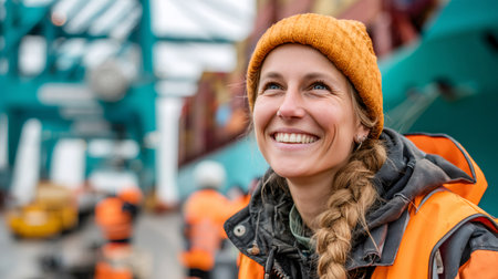 Happy female docker smiling in a shipyard with cargo ship in background, maritime logistics and transport industry