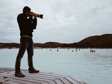 Photographer taking a picture of the blue lagoon in Iceland