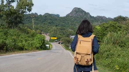 Young traveler woman walking on the road and forest background. Travel concept