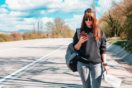 Pretty caucasian woman in a cap and sunglasses, holding a paper map and using a cellphone. Blurred empty road on the background. The concept of local travel and hitchhiking trips.