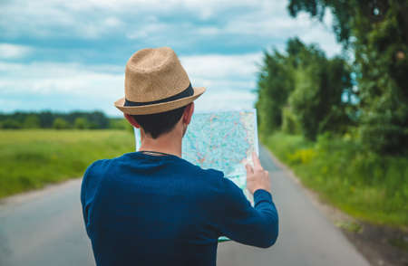 A man looks at a map on the road. Selective focus. Nature.