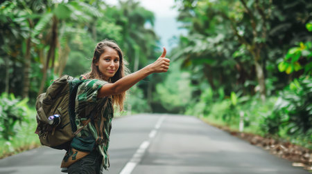 Young female traveler with backpack extending thumb while hitchhiking on deserted road surrounded by lush green forest